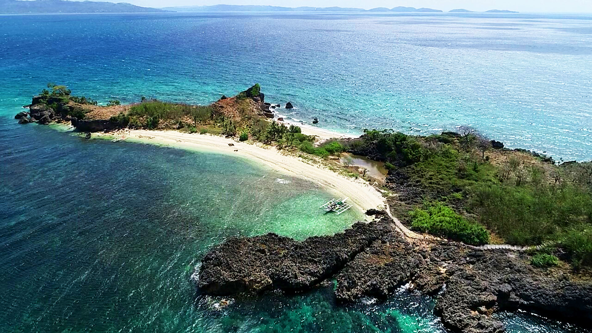 The island has more of corals-filled and yellowish sands, which complements its bone-like shape. The merging of blue and green seawater and the coconut trees dotting the hill in the background make it a view not only very pleasing to the eyes, but also provides a soothing experience of the island life.